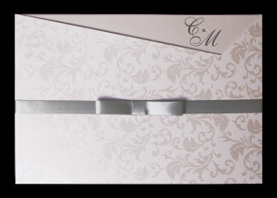 | Convite Fronha Vertical 18x24 com adamascado. Envelope no Color Plus Aspen com epóxi marrom. Convite em Branco Liso com borda pérola e texto em relevo americano. Laço channel, vendido separadamente. |